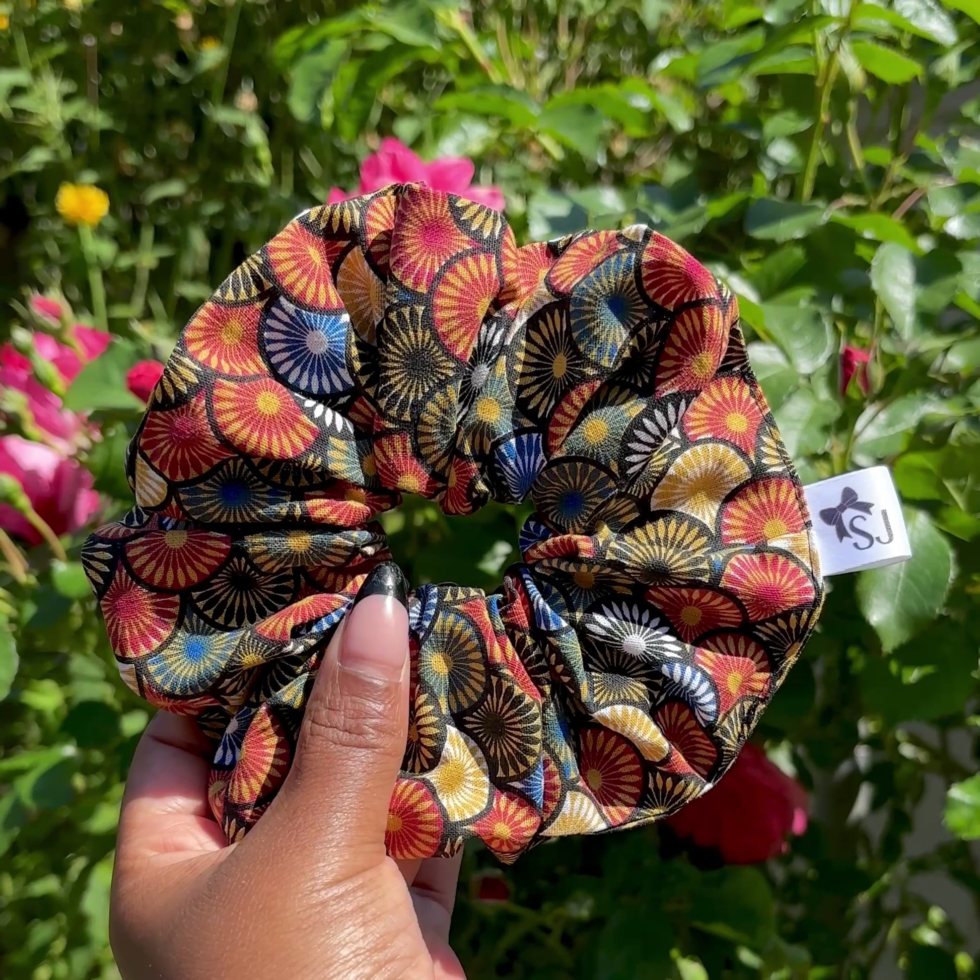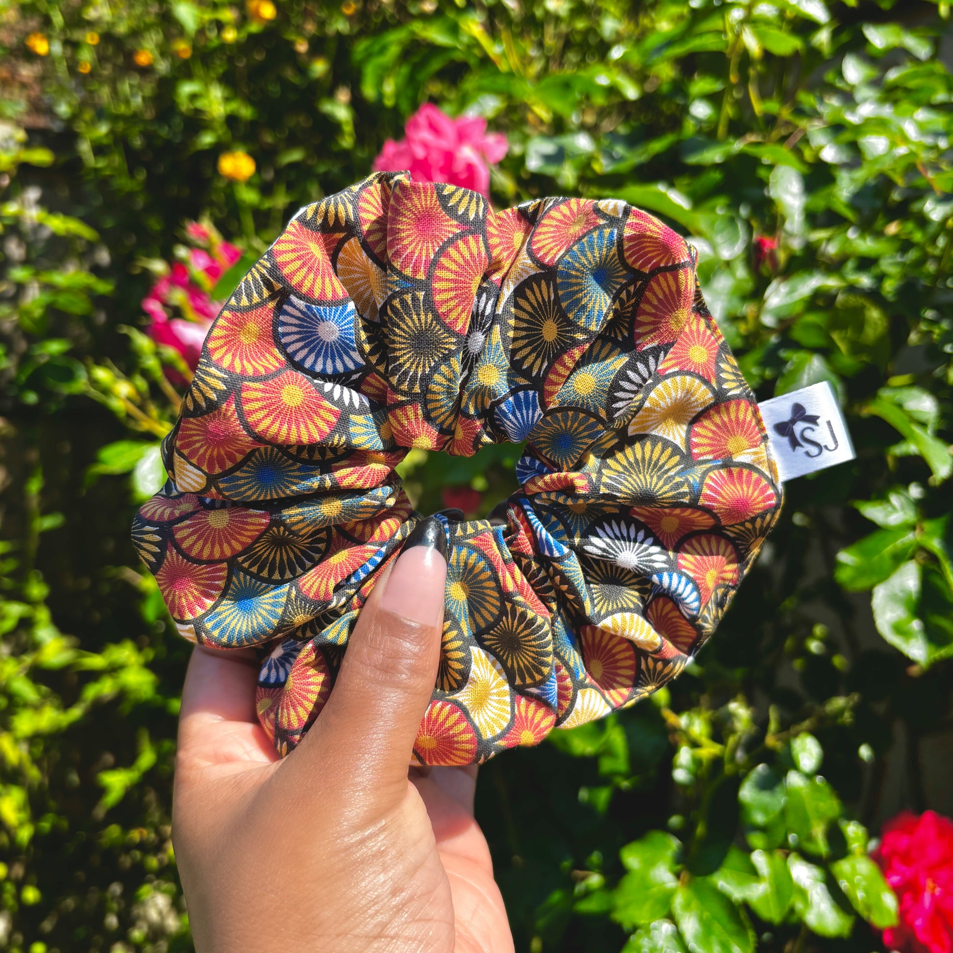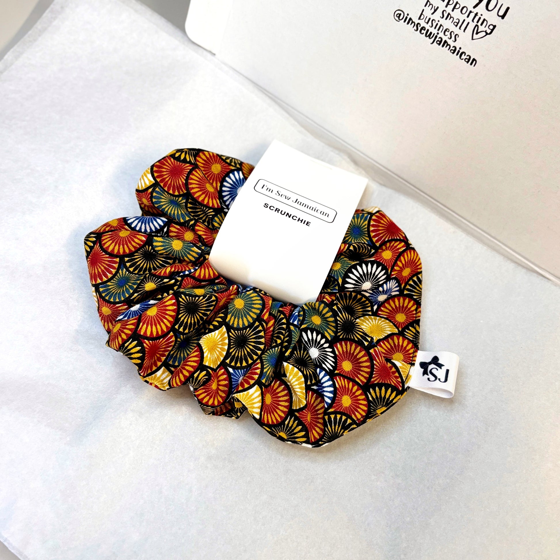 Seigaiha Wave Hair Scrunchie. Style your classic ponytail or messy bun with this oriental print cotton hair tie featuring a bold geometric pattern for everyday wear. The soft and stretchy hair accessory is suitable for both thick and fine hair types, and the elastic twists around twice for a comfortable fit.