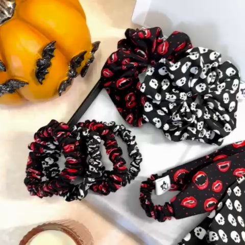 Celebrate Halloween with this black and white skull or red and black vampire teeth four-piece scrunchie and headband gift set. This matching cotton Halloween gift set includes one regular scrunchie, two skinny scrunchies and one headband in two spooky patterns.