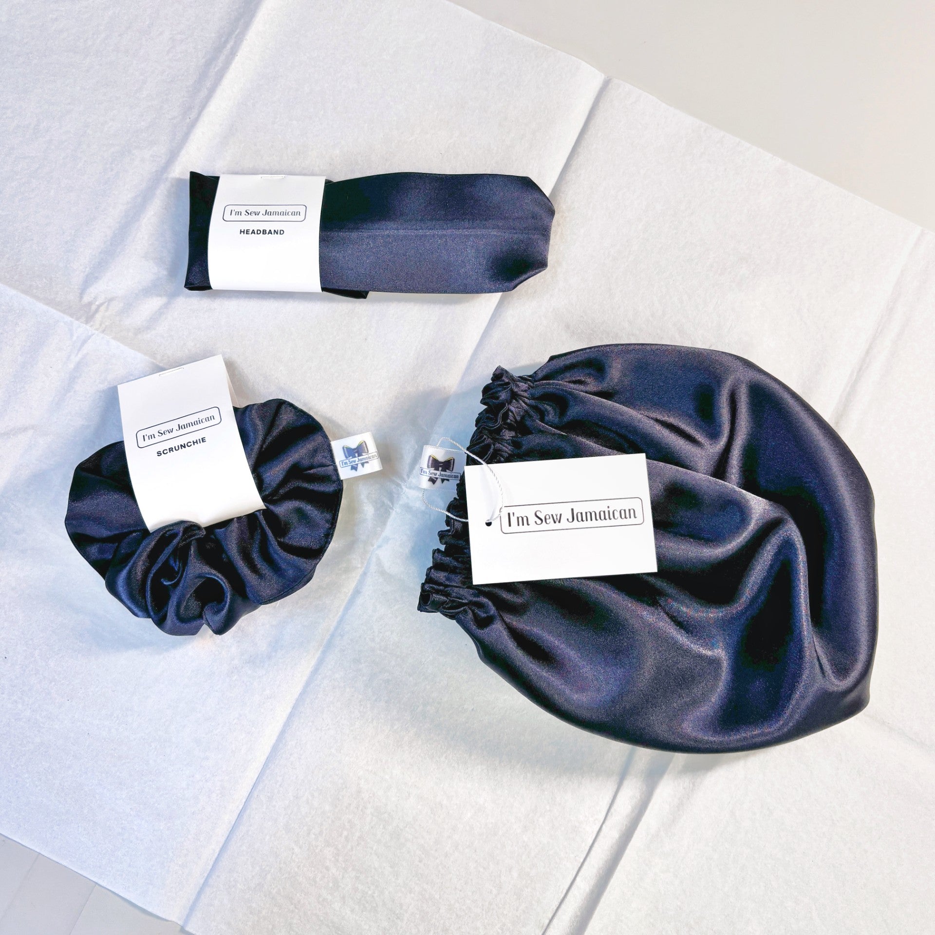 Luxury three piece hair bonnet gift set with silky satin scrunchie and headband.