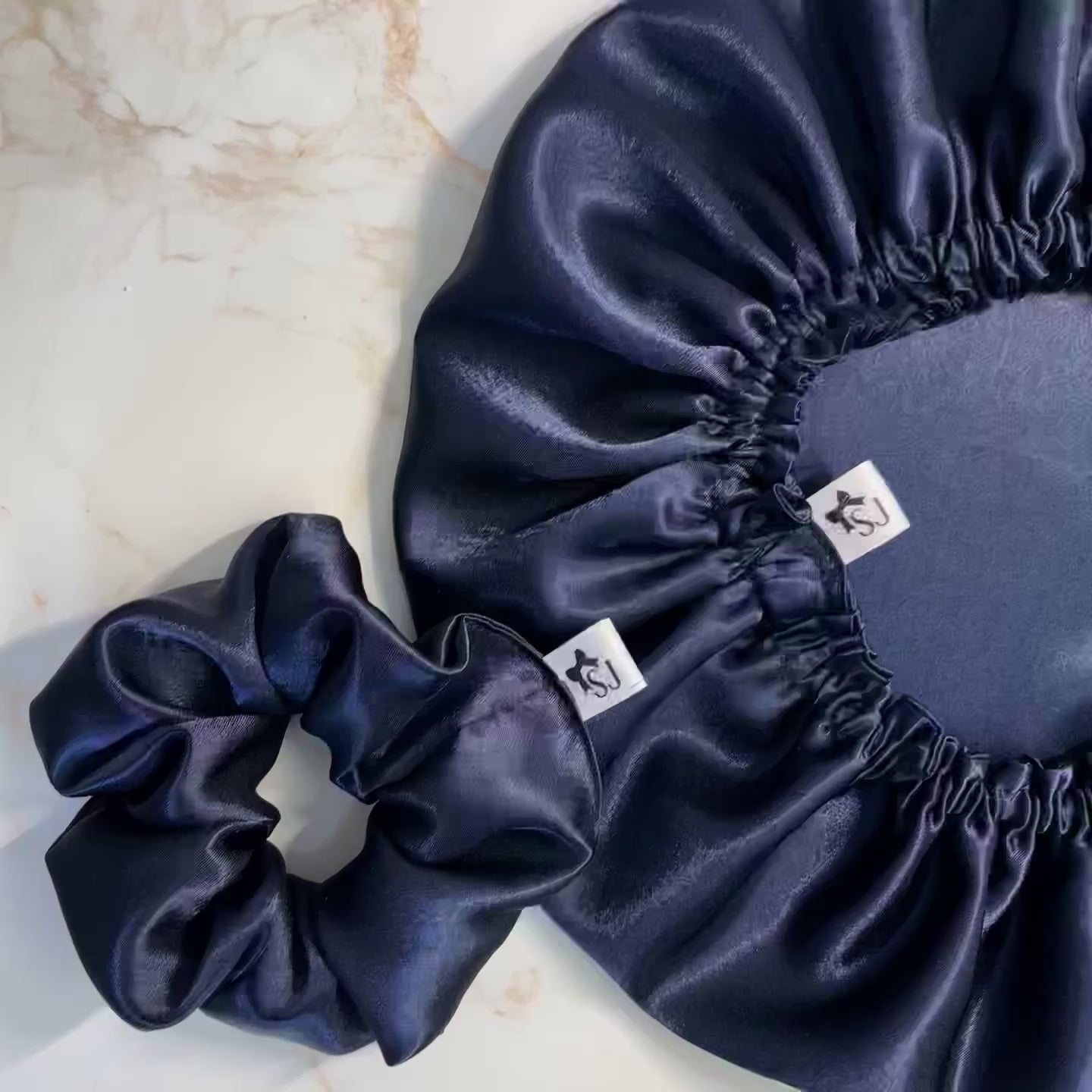 Luxury silk sleep bonnet with matching silk hair scrunchie gift set. This hair wrap for sleeping will retain moisture, reduce dryness and prevent frizz. Style hair with the hair tie with or without headwrap at night. The soft elastic is comfortable and satin fabric doesn't leave kinks, naturally hypoallergenic and reduces hair breakage.